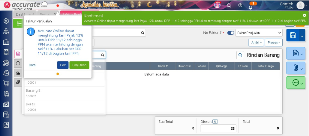 Pada saat Anda menyimpan transaksi Faktur Penjualan, sistem kini akan menampilkan pesan konfirmasi terkait pengaturan tarif PPN, bukan lagi langsung error. Pesan yang muncul kurang lebih sebagai berikut: