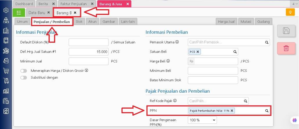 – Cek pengaturan pajak masing-masing barang/jasa, masuk ke menu Persediaan | Barang/Jasa, pilih salah satu item, kemudian buka tab Penjualan/Pembelian.
