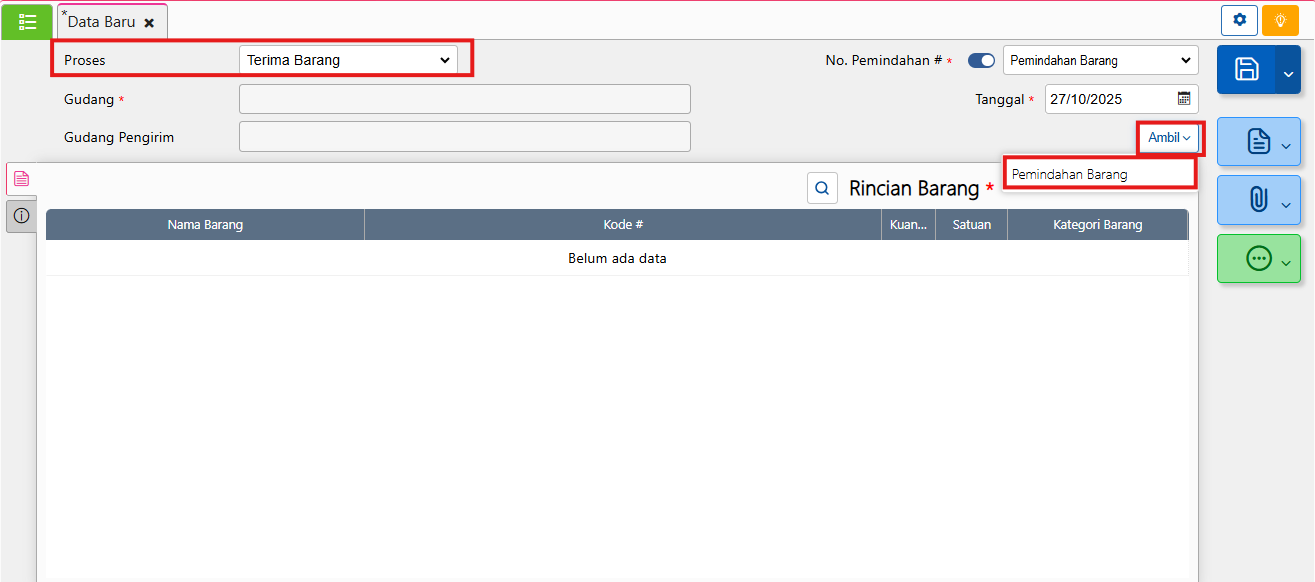 - Pilih proses Terima dan klik ambil dari pemindahan barang.