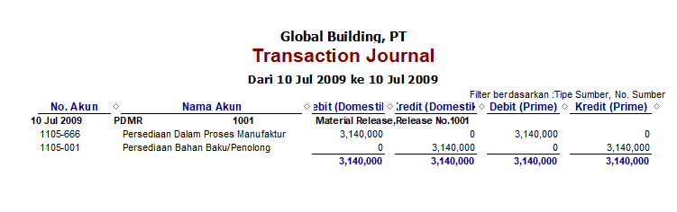 Akun ini dipakai pada saat kita membuat transaksi “Material Release” untuk proses pengeluaran Bahan Baku dari akun WOE atau dari Material Adjustment. Accurate akan menjurnal transaksi tersebut seperti di bawah ini :