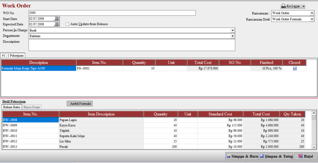 Atau cara lain, jika memang bahan baku sudah tidak mungkin di kembalikan lagi ke gudang, kita Close WOE tsb. Maka ACCURATE akan alokasikan pengambilan bahan baku atas WOE yg di cancel tersebut ke Variance Production Account diakhir bulan setelah Period End.